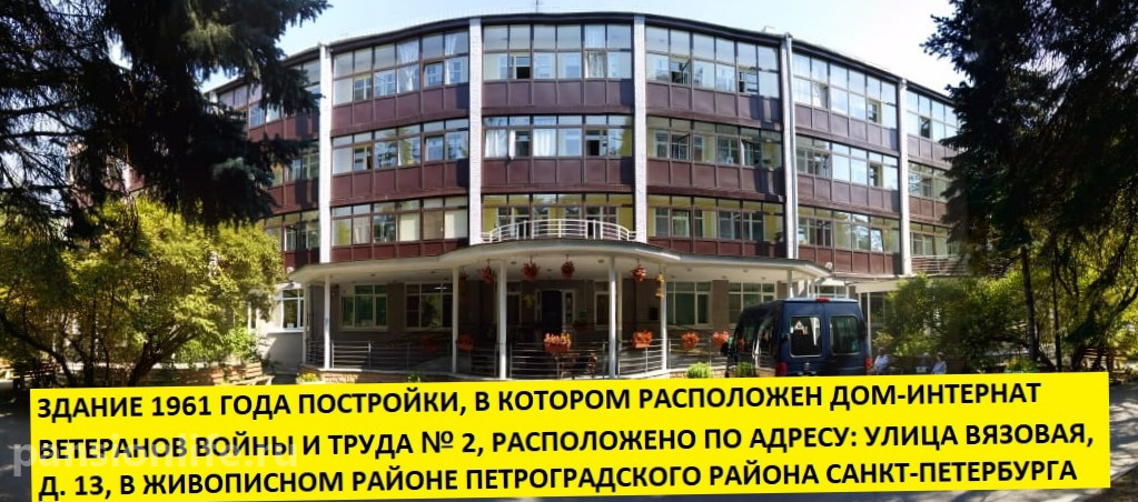 Дом-интернат ветеранов войны и труда №2 находится по адресу г. Санкт-Петербург, ул. Вязовая улица, дом 13, литера А.