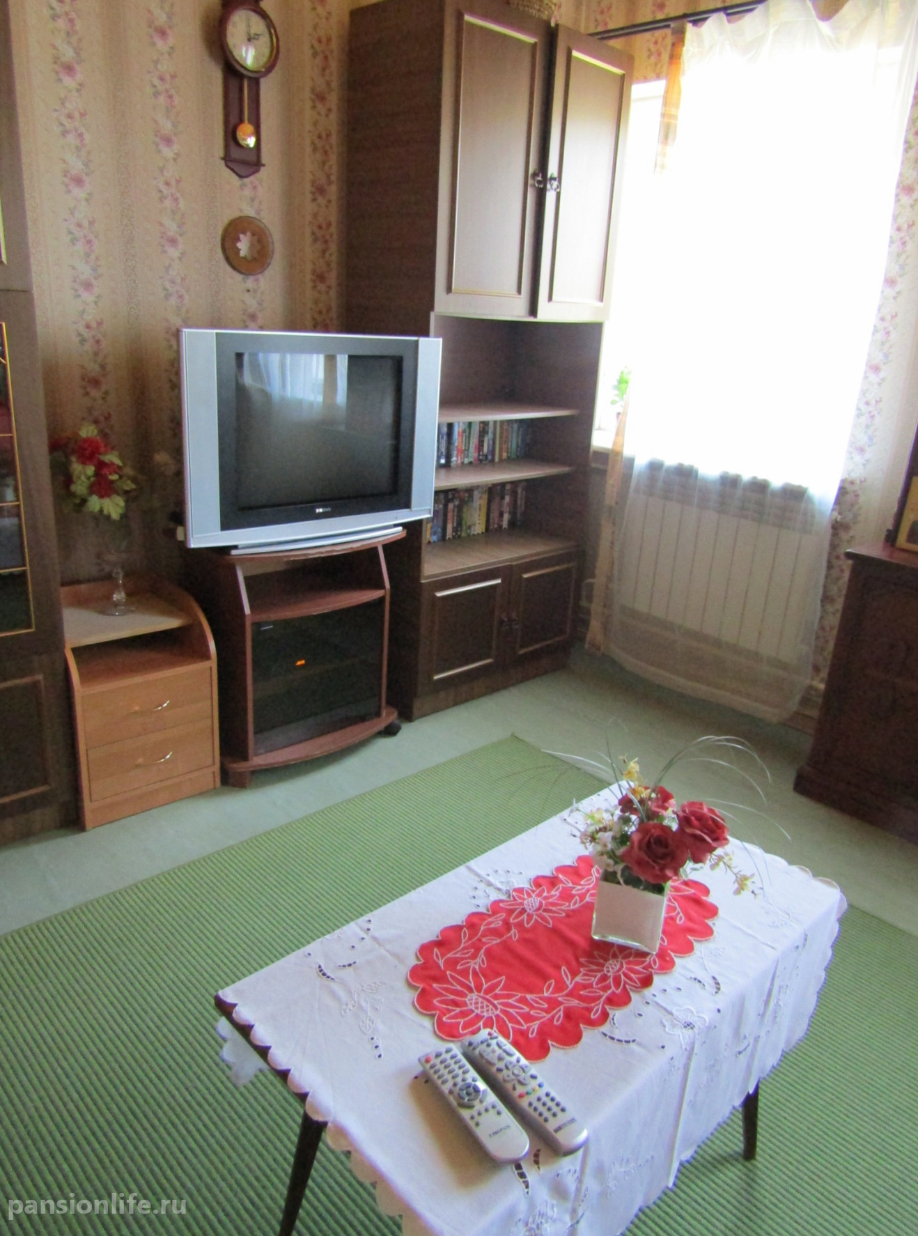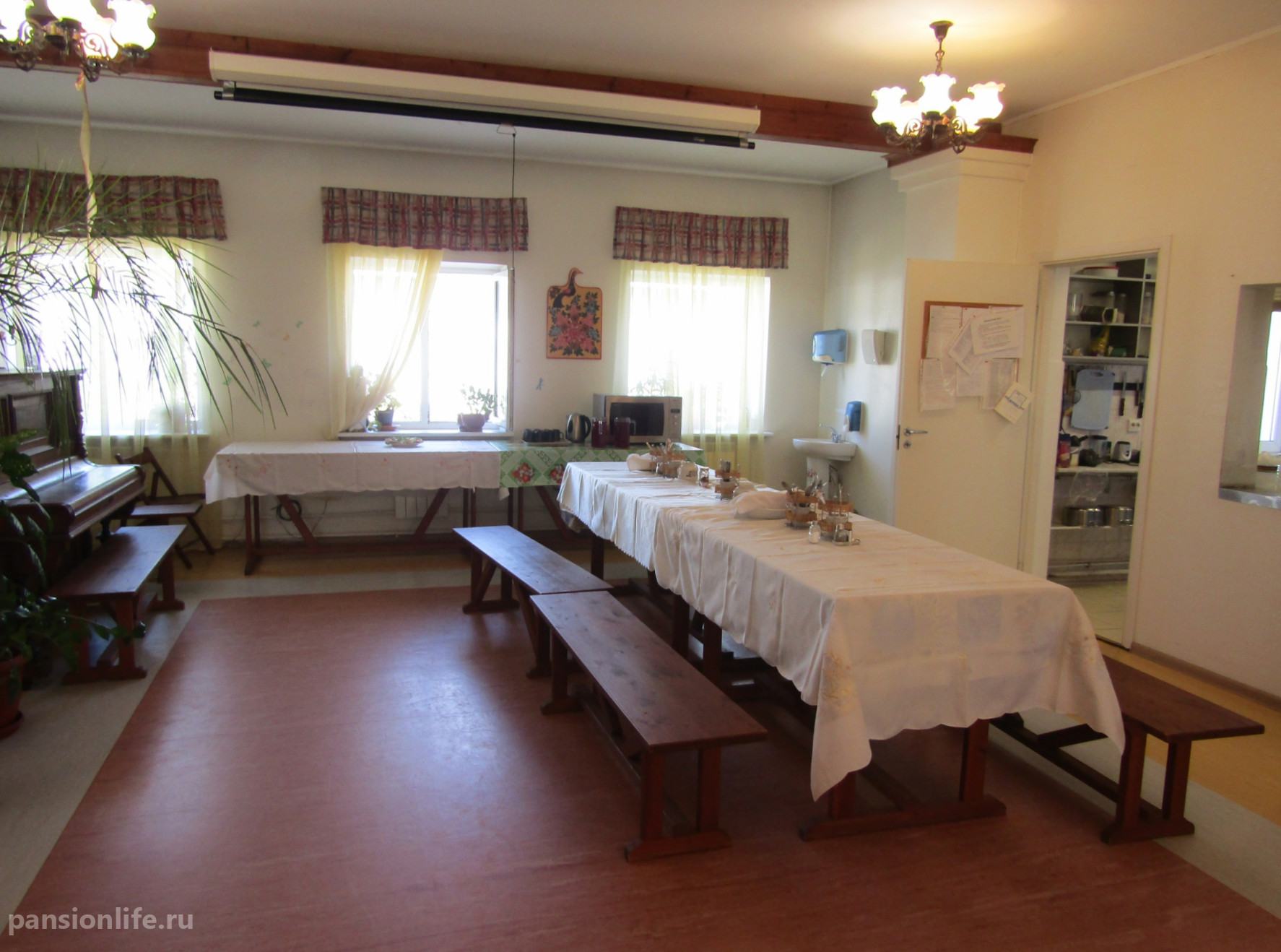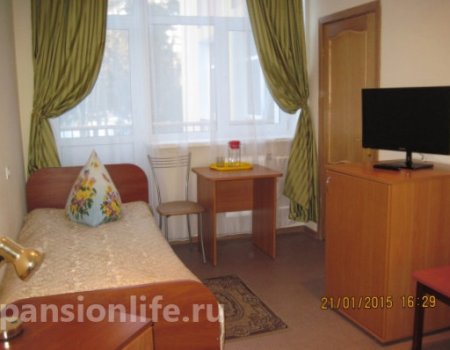 Проживание предлагается на первом этаже в одноместных, двухместных или трехместных номерах, оснащенных необходимой мебелью и оборудованием для проведения лечебно-оздоровительных процедур. Отдельное внимание уделяется питанию: пятиразовое диетическое меню составляется по рекомендациям врача, при необходимости оказывается помощь во время приема пищи.