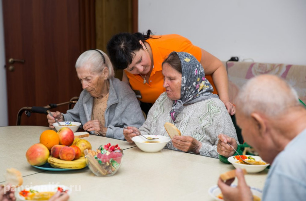 Полноценное пятиразовое питание, меню для которого разрабатывается при участии геронтолога.